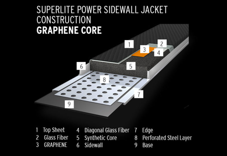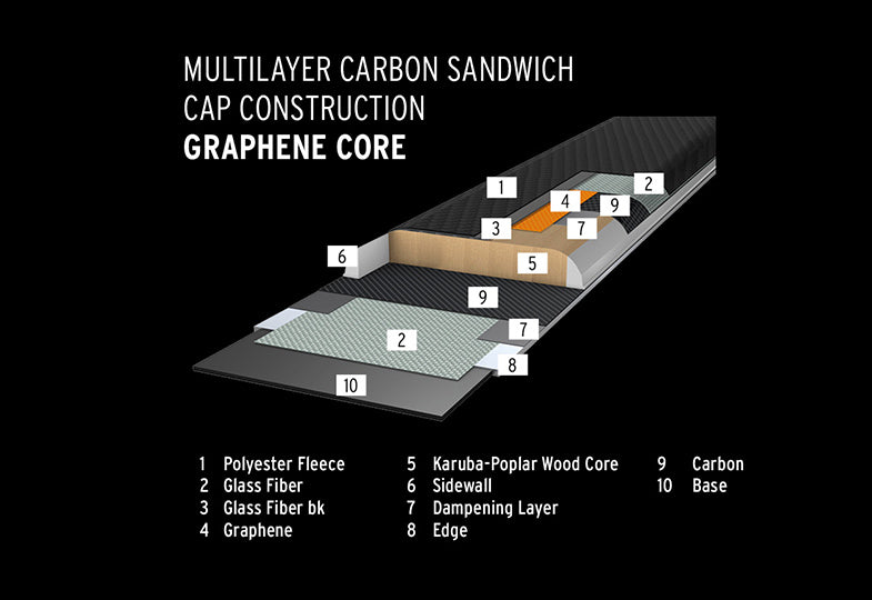 To make this construction even lighter, material from the heart has been replaced by a lighter material. A layer of Graphene has been inserted to not only insure the performance is unchanged but actually increased. The overall thickness of the core is reduced, making it a composite that is easy and forgiving, but always precise.