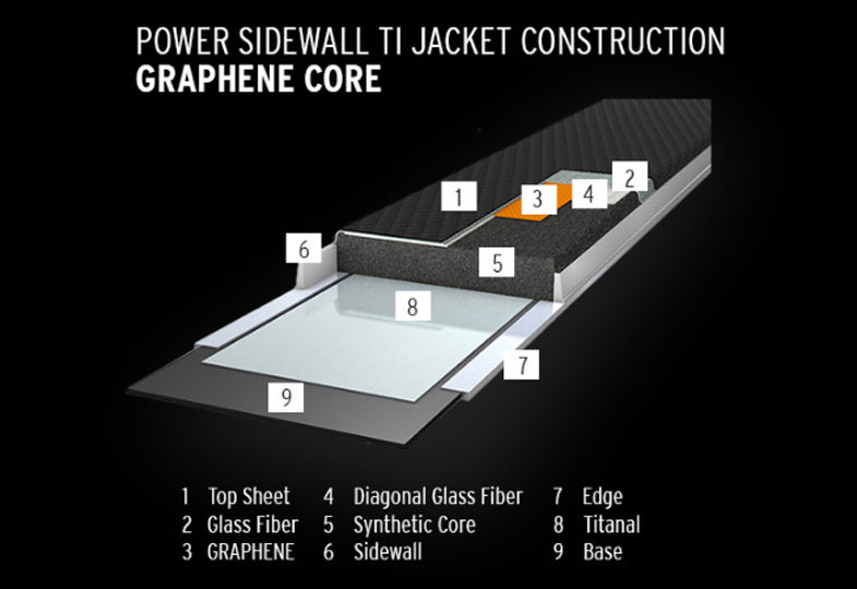 The Titanal and Graphene layers create a solid and responsive ski. The synthetic injected core is supported with ABS sidewalls. This allows for a soft longitudinal flex coupled with a super responsive torsional flex.