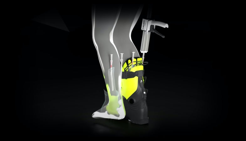Your fitter will place Liquid Fit cartridge through the black “door” of the injection gun and close the “door” until it firmly clicks. Then lock the injection tube to the end of the cartridge with a 90 twist. Beginning with the internal side, your filter will start injecting while you stand in a skiing position, inject roughly a quarter of the cartridge for each side. Add material as necessary, to reach the desired level of ankle retention.